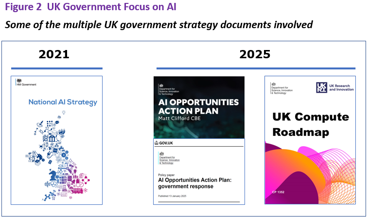 The 2021 National AI Strategy confirmed the huge potential in AI to drive economic growth. And it highlighted that alongside growth, AI could increase productivity, resilience, and innovation across both private and public sectors. That heady mix set AI’s foundations for the UK. Opportunities to explode AI use came to life during 2025, through both its January AI Opportunities Action Plan (AIOAP) and its July Compute Roadmap. (See Figure 2)