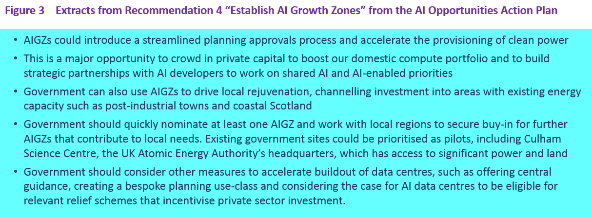 AIOAP recommendation 4 (AIOAP #4, Figure 3) tackled the mechanics for necessary infrastructure head-on. Measures to catalyse the much-needed data centre developments and associated services were proposed by creating AI Growth Zones (AIGZs) around the country. Those AIGZs could bring in much needed investment, and kickstart local economic growth. In turn, that was aimed at realising the potential highlighted in the government’s Plan for Change.