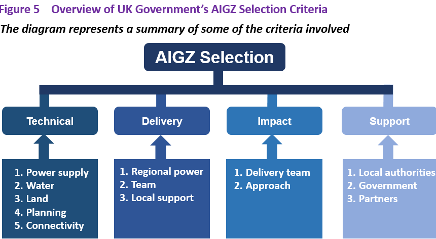 Technical, delivery, impact and support criteria were specified for prospective AIGZs to satisfy. Each headline criterion had several subcategories (indicated in Figure 4, but readers should follow the precise requirements of the government’s application call). Applicants were asked to support their with by specific evidence in each category.