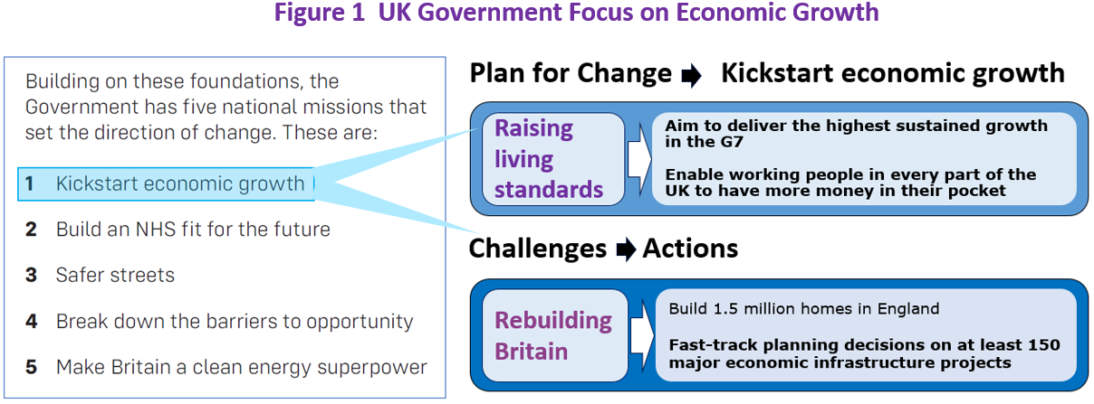 The drive for economic growth has been the aim of many UK governments and became the Number 1 Priority for the July 2024 UK government under its “Plan for Change”. Indeed, its “Kickstart Economic Growth” set challenges of delivering the highest sustained growth in the G7 and fast-tracking planning decisions (See Figure 1). Fundamentally though, the Plan For Change determined to harness the incredible potential of artificial intelligence to deliver on the five missions.