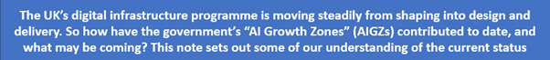 Crucially, a major boost to AIGZ implementation came with November’s government package of measures to speed and simplify planning processes and accelerate access to power at attractive prices (see Figure 7 outline). Readers should conduct their own analysis of that package. In our opinion, there is still much detail to be announced to implement it. And in our view, ongoing government consultations on changes to the National Planning Policy Framework and a National Policy Statement for Data Centres may well prove a crucial turning point in the next 3 months. and may be well worth contributing to if you are a UK data centre stakeholder.