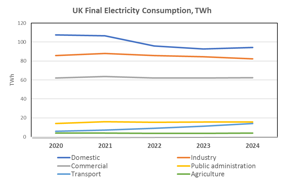 We have been told by DESNZ that they report electricity demand from operating data centres under “Commercial Consumption”, and not as a line item in its own right. Commercial consumption was actually the 3rd largest in 2024, with electricity for housing markets dominating, followed by industrial consumption (see insert of UK Final Electricity Consumption, TWh).