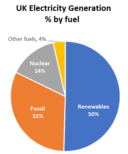 A further insight comes from checking progress towards clean fuel sources (see insert ‘UK Electricity Generation, % By Fuel’). Nudging just over 50% of total generation in 2024, renewables scored a new record contribution. Fossil fuels accounted for just over 30%. Nuclear made the other major contribution with just under 15%.