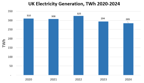 Our first observation is that the trend in UK generation has been somewhat in decline. Since 2020, total generation has fallen 8% according to DENZ data (see insert ‘UK Electricity Generation 2020-2024’).