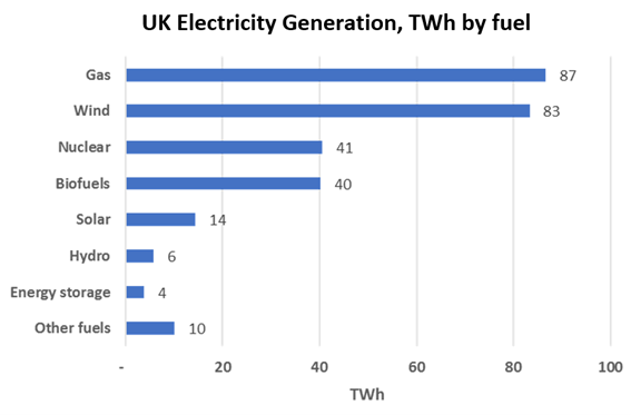 - In absolute terms, gas and wind dominated the fuels used for power generation in 2024. Each provided over 80 TWh, with gas leading the way by a good margin. This is quite a stark reminder of the importance of gas in UK generation.